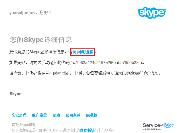 然后,到您的邮箱中查收"用户名符"邮件,打开邮件,点击"访问此链接",在新弹出页面将显示您通过此邮箱注册的Skype用户名,您可选择登录或更改密码。