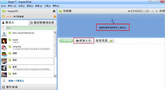 第二步:对创建的“空的组”添加要需要参加视频的好友,可用鼠标直接把联系人拖到“空的组”,也可以选择“添加人名”添加(如图2)。