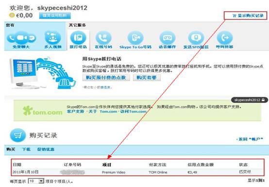 第二步:从页面中点击右上方的“显示购买记录”链接,显示您多人视频套餐的购买记录(如图8)。