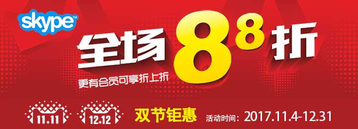 双11来临,skype中文充值服务网推出的优惠活动正式开抢。 〖skype充值双十一活动详情〗 活动期间,本网站全线skype充值产品, 订单金额满100元,立减10元; 订单金额满200元,立减20元; 订单金额满300元,立减30元; 以此类推,不设上限。 活动时间:2016.11.7到2016.12.31 ...