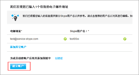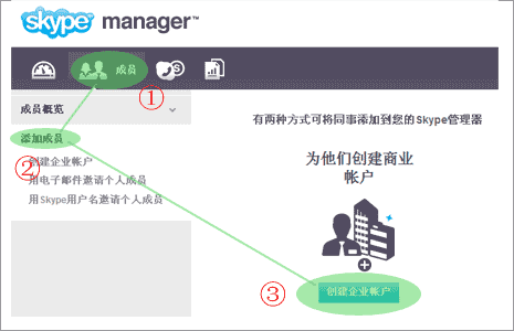 点击打开 https://secure.skype.com/business/intl/zh-Hans/info/login?setlang=zh-Hans输入skype账号及登录密码,登录skype管理器。 - 点击如下图所示“成员”→“添加成员”→“创建企业账户”