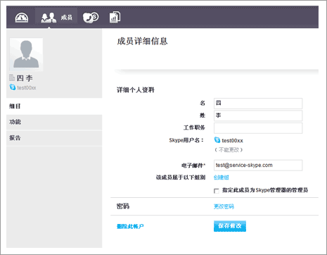 - 可以在成员列表中,看到刚刚建立的skype企业用户,点击姓名,即可编辑此skype用户。