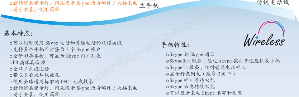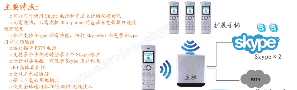 全球第一款真正脱离电脑使用的Skype无线话机RTX Dualphone今天正式上市。这款型号为DUALphone 4088的无绳话机的底座其中有一个接口只需要直接连接宽带路由器,而不再需要依赖电脑来拨打Skype电话。同时另外一个接口接普通电话线,以达到可以用来拨打和接听普通电话的双模功能。无线的距离可以达到300米,这样方便用户在任何一个房间里面使用。