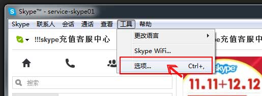 1、点击skype软件菜单,“工具”→“选项”,如下图所示: