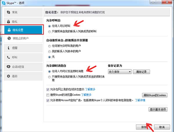 你需要更新Skype设置,允许来自未在你的联系人列表上的用户的来电或消息。